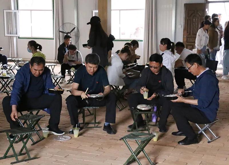 中午,老師們品嘗了特色紅軍餐:黃米飯、窩窩頭、土豆絲、小米粥。磚鋪的地面,沒有餐桌,每人一個馬扎凳,吃著憶苦思甜飯,緬懷那段艱苦的歲月。這些從歷史走來的粗茶淡飯,告訴大家:一餐一粒來之不易,優(yōu)良傳統(tǒng)躬身傳承。