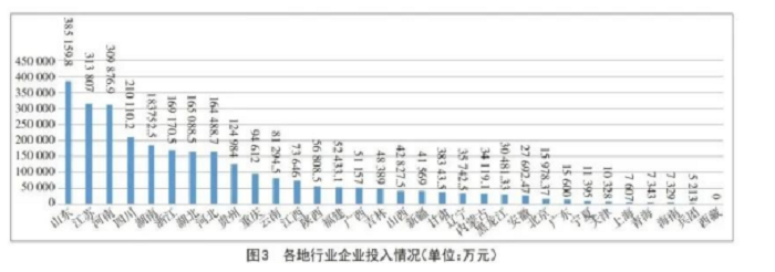 二是鼓勵(lì)行業(yè)企業(yè)深度參與。行業(yè)企業(yè)參與是激活職業(yè)教育改革發(fā)展的重要動力。數(shù)據(jù)顯示,行業(yè)企業(yè)擬投入總計(jì) 281.63 億元,占 全國預(yù)計(jì)總投入經(jīng)費(fèi)的 9.16%。行業(yè)企業(yè)投入超過 10 億元的分別有 山東、江蘇、河南、四川、湖南、浙江、湖北、河北、貴州等 9 省份, 西藏?zé)o行業(yè)企業(yè)投入(圖 3)。行業(yè)企業(yè)投入占本省總投入比重超過 10%的分別有河南(14.95%)、江蘇(13.93%)、山東(13.65%)、 黑龍江(12.50%)、湖南(12.25%)、云南(12.23%)、貴州(11.70%)、 河北(10.06%)。41 個(gè)可由學(xué)校承接的任務(wù)(項(xiàng)目)點(diǎn)均有行業(yè)企 業(yè)投入,其中,建設(shè)高水平專業(yè)化產(chǎn)教融合實(shí)訓(xùn)基地(55.66 億元)、 省域高水平高職學(xué)校(54.05 億元)、省域高水平專業(yè)群(30.07 億 元)投入最多。數(shù)據(jù)表明,行業(yè)企業(yè)已成為職業(yè)教育辦學(xué)的一支重要 力量,職業(yè)教育正在由政府舉辦為主向政府統(tǒng)籌管理、社會多元辦學(xué) 的格局轉(zhuǎn)變。
