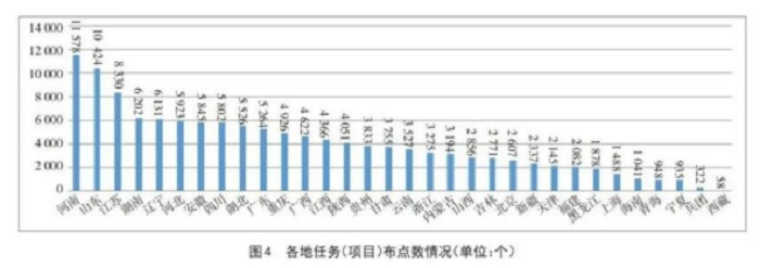一是各地競相承接,省際比學(xué)趕超態(tài)勢初步顯現(xiàn)??傮w來看,各 地承接情況呈現(xiàn)任務(wù)(項(xiàng)目)全、數(shù)量多的特點(diǎn)。有 12 個(gè)省份承接 了全部的45項(xiàng)任務(wù),占比37.5%;有7個(gè)省份承接了44項(xiàng),占比21.9%。 《行動計(jì)劃》設(shè)計(jì)的改革任務(wù)以定性為主,定性定量結(jié)合,定性任務(wù) 突出改革指導(dǎo)性方向性,定量項(xiàng)目突出改革成果的可測量性。據(jù)統(tǒng)計(jì), 全國各地職業(yè)院校承接任務(wù)(項(xiàng)目)總布點(diǎn) 128042 個(gè),布點(diǎn)數(shù)超過 5000 個(gè)的省份有 10 個(gè),其中河南(11578 個(gè))、山東(10424 個(gè))、 江蘇(8330 個(gè))、湖南(6202 個(gè))、遼寧(6131 個(gè))布點(diǎn)數(shù)體量最 大(圖 4)。從區(qū)域分布上看,東部省份布點(diǎn) 48710 個(gè),中部省份布 點(diǎn) 35177 個(gè),西部省份布點(diǎn) 44155 個(gè),分別占總布點(diǎn)數(shù)的 38.04%、